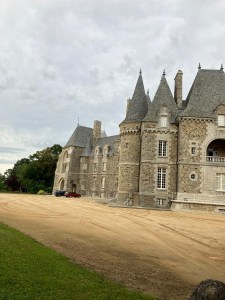 An evening walk after supper to Château Bel-Air. The Château as it is today, is the result of two reconstructions. It is located on the site of an old mansion that belonged to the Charil de la Rousselière from 1516 and which passed to an English merchant, called Legge, who came to France in 1608. The old mansion was flanked by a square tower and a dovecote, decorated with 2 French gardens. Rather than reconstructing it, Louis de Legge commissioned Jacques Mellet, architect of Rennes, to reconstruct it from 1870 to 1873. The new building, with a neo-Gothic look, is composed of 2 perpendicular pavilions widely pierced and castellized by the diagonal flanking of two pepper towers.